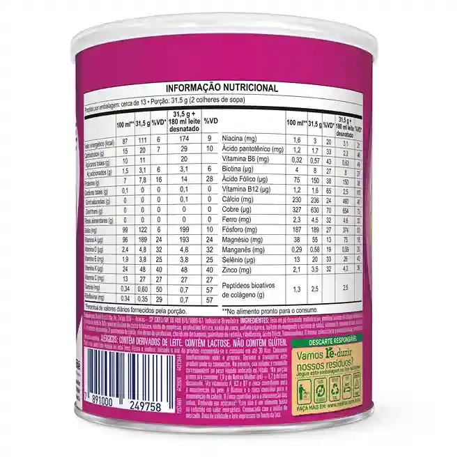 Ingredientes: Leite em pó desnatado, maltodextrina, colágeno (8%), minerais (fosfato de cálcio tribásico, óxido de magnésio, pirofosfato férrico, óxido de zinco, sulfato de cobre, sulfato de manganês e selenito de sódio), vitaminas (L-ascorbato de sódio, acetato de DL-alfa-tocoferila, nicotinamida, D-pantotenato de cálcio, cloridrato de piridoxina, cloridrato de cloreto de tiamina, palmitato de retinila, riboflavina, ácido N-pteroil-L-glutâmico, fitomenadiona, D-biotina, colecalciferol e cianocobalamina), aromatizantes e edulcorante sucralose.