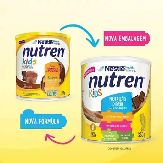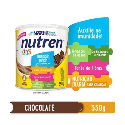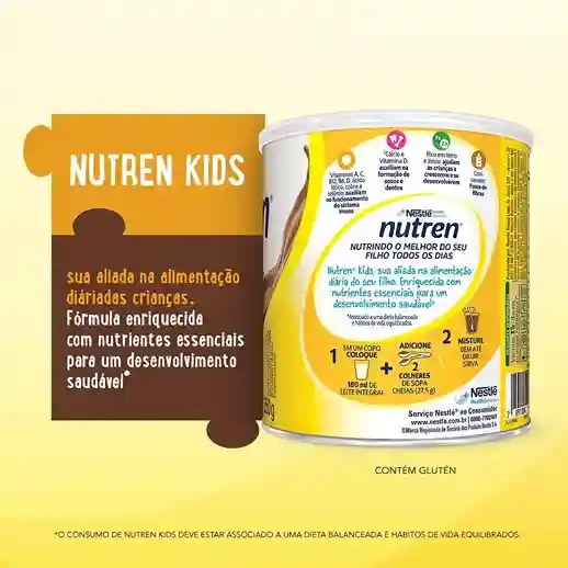 Nutren Kids NUTREN® Kids Chocolate é o complemento alimentar da Nestlé desenvolvimento especialmente para crianças, já vem com leite, basta adicionar água! Fornece 26 vitaminas e minerais e é rico em cálcio, ferro e zinco, nutrientes essenciais que ajudam seu filho a viver o melhor desta fase da vida. Leite integral (leite integral, carbonato de cálcio, L-ascorbato de sódio, pirofosfato férrico, acetato de DL-alfa-tocoferila, sulfato de zinco, carbonato de magnésio, acetato de retinila, colecalciferol), açúcar, preparado à base de cereal [farinha de trigo integral (11%), farinha de trigo enriquecida com ferro e ácido fólico (10%), açúcar, água, carbonato de cálcio e estabilizante hidrogenofosfato de di-sódio], polidextrose, cacau em pó, maltodextrina, minerais (fosfato de cálcio tribásico, óxido de magnésio, pirofosfato férrico, sulfato de zinco, sulfato de manganês, sulfato de cobre, iodeto de potássio, selenito de sódio, cloreto de cromo, molibdato de sódio), vitaminas (bitartarato de colina, L-ascorbato de sódio, acetato de DL-alfa-tocoferila, nicotinamida, D-pantotenato de cálcio, cloridrato de piridoxina, cloridrato de tiamina, acetato de retinila, riboflavina, ácido N-pteroil-L-glutâmico, fitomenadiona, colecalciferol, D-biotina, cianocobalamina), emulsificante lecitina, espessante goma xantana, aromatizantes.