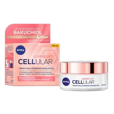 Ideal para hidratar, suavizar e reduzir visivelmente as rugas profundas, o creme facial Nivea Cellular Expert Lift Avançado Dia também estimula a produção de colágeno em 4 horas e ajuda a redensificar e fortalecer as fibras de sustentação, fortalecendo a pele e melhorando os contornos faciais.