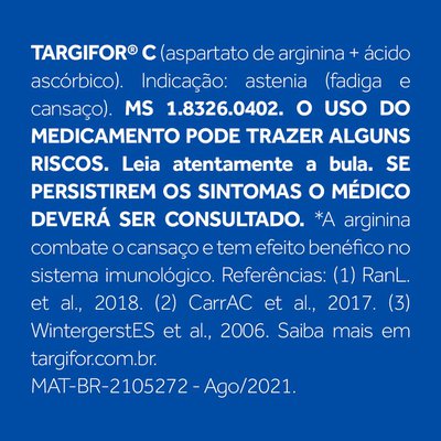 Targifor C conta com o poder da arginina e da vitamina C que elimina as toxinas do cansaço, além de fortalecer o sistema imunológico.